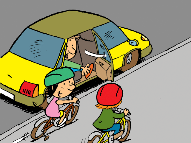 « Mathilde, attention ! », avertit le grand-père. Trop tard : la petite fille donne un coup de guidon pour l'éviter, mais elle accroche la portière.