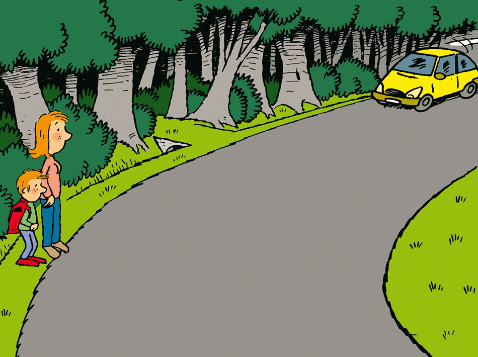 Dans cette histoire, tu verras qu'en dehors des villes, lorsque les routes ne sont pas bordées par un trottoir et qu'il n'y a pas de passage pour piétons, tu dois être très prudent pour te déplacer.